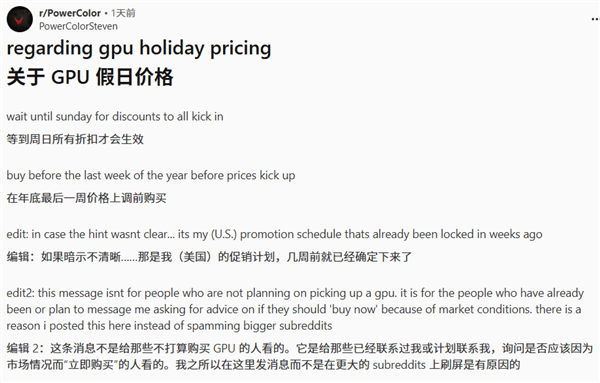 撼讯的公关代表Steven在Reddit上发帖,提醒潜在的显卡买家:“等到周日折扣将全部生效,并在年底的最后一周前购买,因为之后价格将会上涨。”
