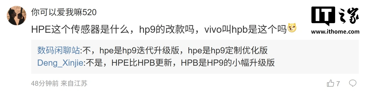 后续有用户在评论区询问:“HPE 这个传感器是什么,hp9 的改款吗,vivo 叫 hpb 是这个吗