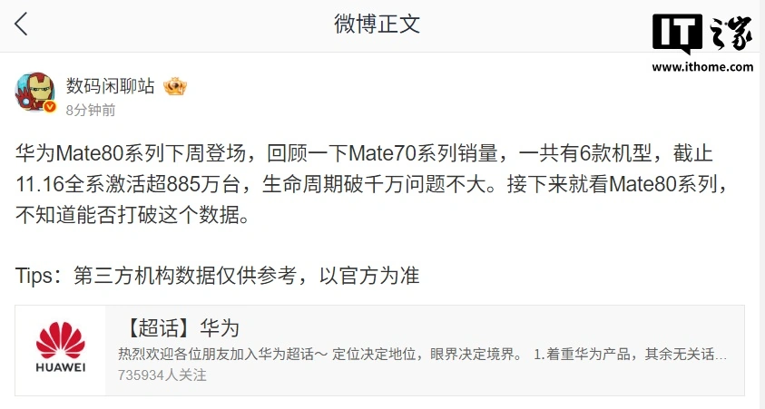 文章来源于互联网:IT之家-消息称华为 Mate 70 全系激活已超 885 万台,生命周期有望破千万