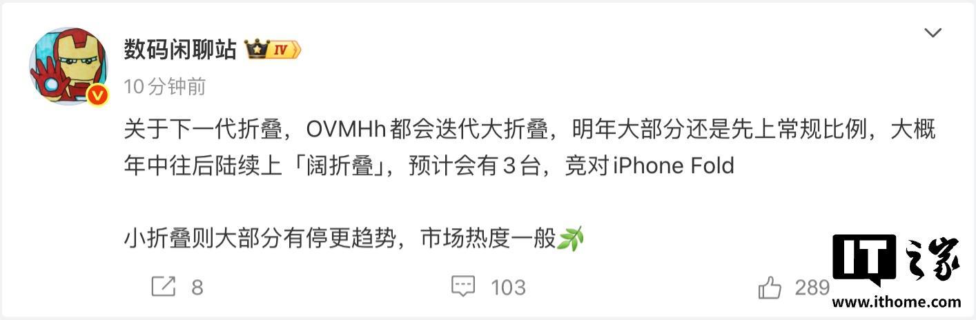 IT之家 11 月 24 日消息,今天午间,博主 @数码闲聊站 爆料称,OVMHh(从缩写判断预计为 OPPO、vivo、小米、华为、荣耀)旗下的大折叠机型预计会迎来迭代。