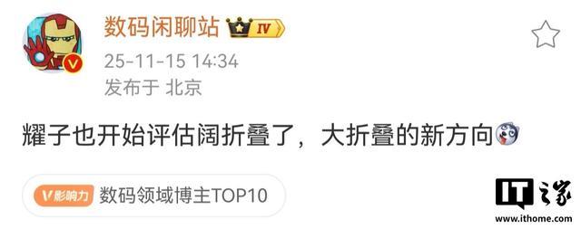 本月早些时候,同一博主就放出消息称,荣耀开始评估阔折叠手机,大折叠的新方向。