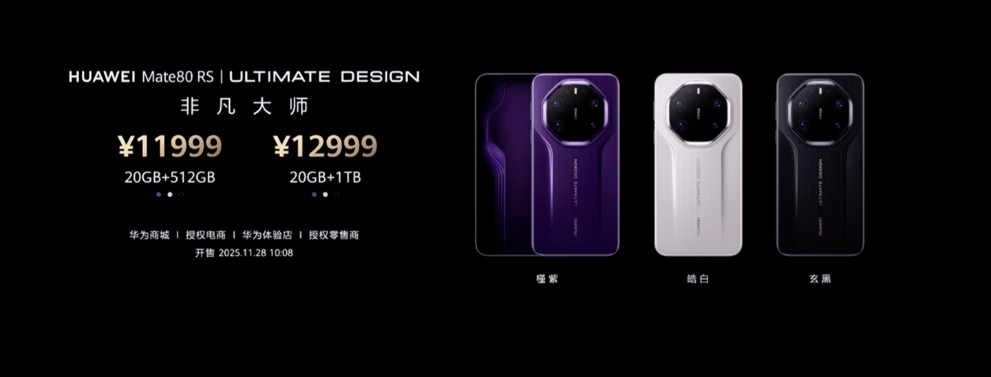 结合IT之家此前报道,华为 Mate 80 RS 非凡大师手机售价 12999 元起,采用“双面昆仑”外观设计,配有第二代昆仑玻璃后盖和第三代玄武钢化昆仑玻璃屏幕,业界首发 BD.2022 色域双层 OLED,相比 P3 色域覆盖提升 30%。