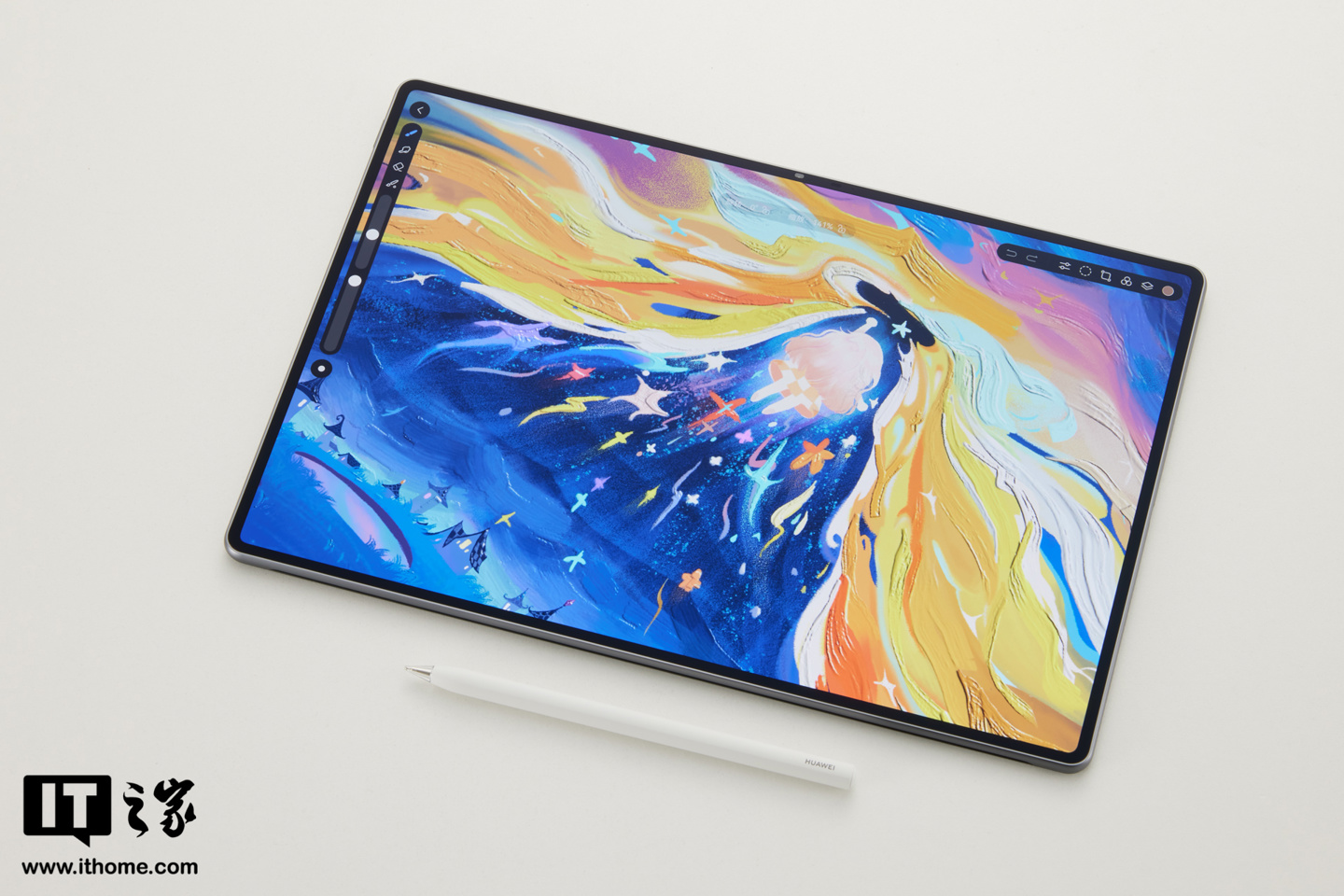 配合最新一代的 HUAWEI M-Pencil Pro,手写笔吸附在机身侧边,随取随用;在“天生会画”App 中,你可以利用手写笔的侧旋功能调整笔刷,感受重力流体笔刷带来的真实创作体验。