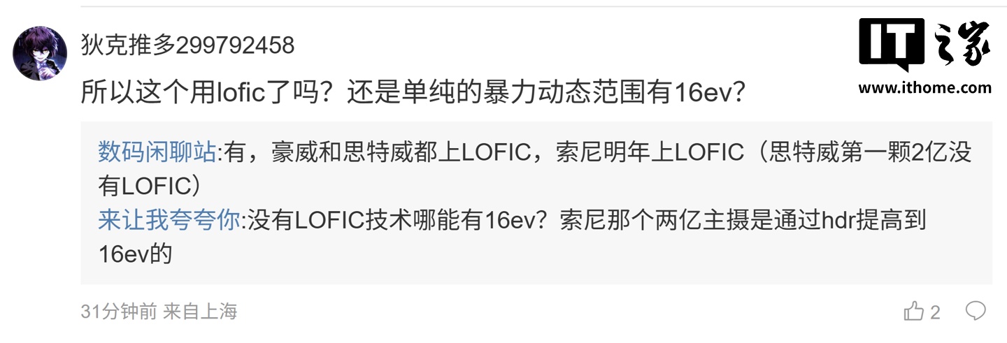 另一名用户则询问道:“所以这个用 lofic 了吗?还是单纯的暴力动态范围有 16ev?”,博主则回复道:“有,豪威和思特威都上 LOFIC,索尼明年上 LOFIC(思特威第一颗 2 亿没有 LOFIC)”。