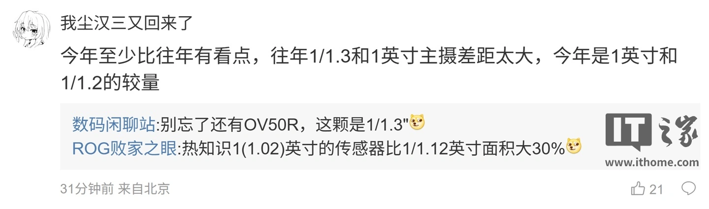 后续有用户在评论区询问:“今年至少比往年有看点,往年 1/1.3 和 1 英寸主摄差距太大,今年是 1 英寸和 1/1.2 的较量”,博主回复道:“别忘了还有 OV50R,这颗是 1/1.3″