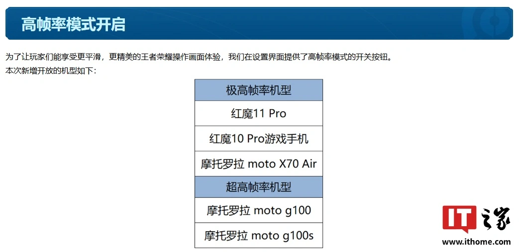 文章来源于互联网:IT之家-红魔 11 Pro、摩托罗拉 moto X70 Air 等机型开放《王者荣耀》极高帧率