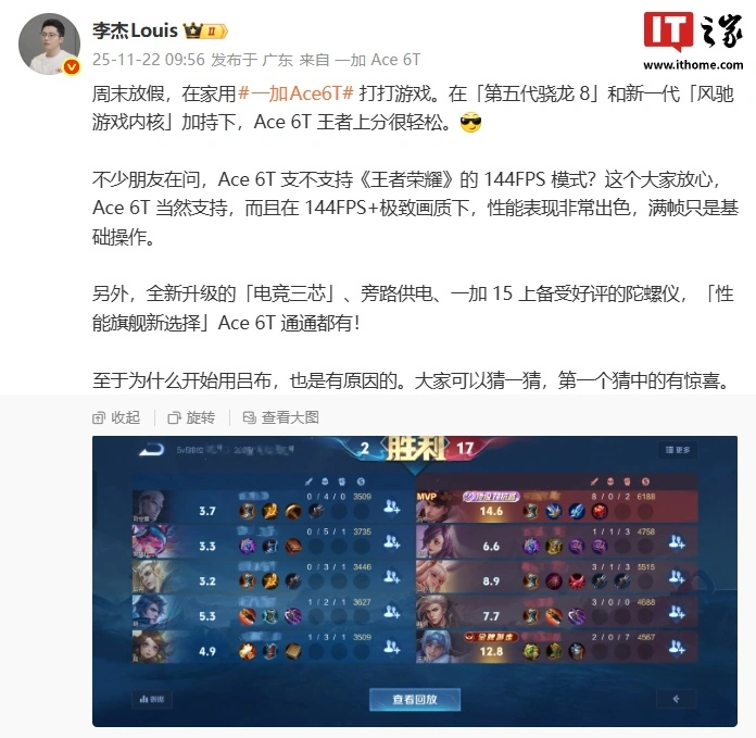 值得一提的是,《王者荣耀》目前正在逐步开放 144Hz 极致帧率。参考IT之家此前报道,iQOO 15 全球首发王者荣耀原生 144FPS + 极致画质,目前一加 15、荣耀 GT Pro 等机型也已官宣适配。此外,一加 Ace 6T 手机也将支持《王者荣耀》144 帧模式。