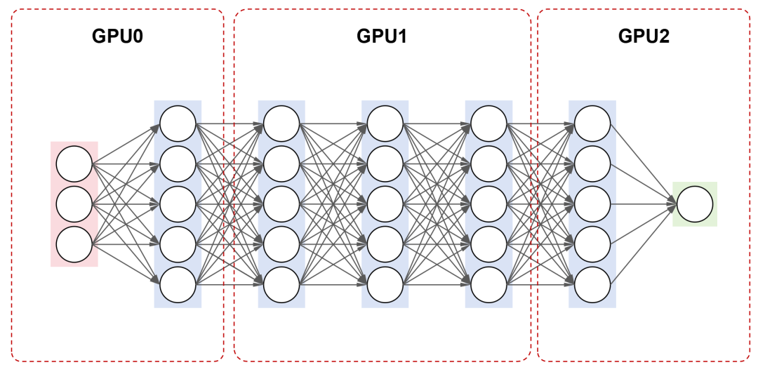 例如,对于一个包含 7 层的神经网络,将 1~2 层放在第一个 GPU 上,3~5 层放在第二个 GPU 上,6~7 层放在第三个 GPU 上。训练时,数据按照顺序,在不同的 GPU 上进行处理。