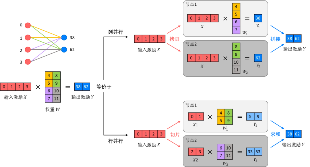 张量切分方式分为按行进行切分和按列进行切分,分别对应行并行(Row Parallelism)(权重矩阵按行分割)与列并行(Column Parallelism)(权重矩阵按列分割)。