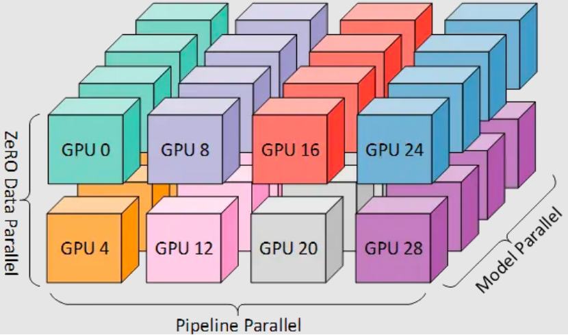 更高级的,是 3D 并行,通过“数据并行 + 张量并行 + 流水线并行”,实现三重拆分,是超大模型训练的主流方案。