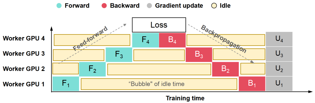 乍一看,流水并行有点像串行。每个 GPU 需要等待前一个 GPU 的计算结果,可能会导致大量的 GPU 资源浪费。