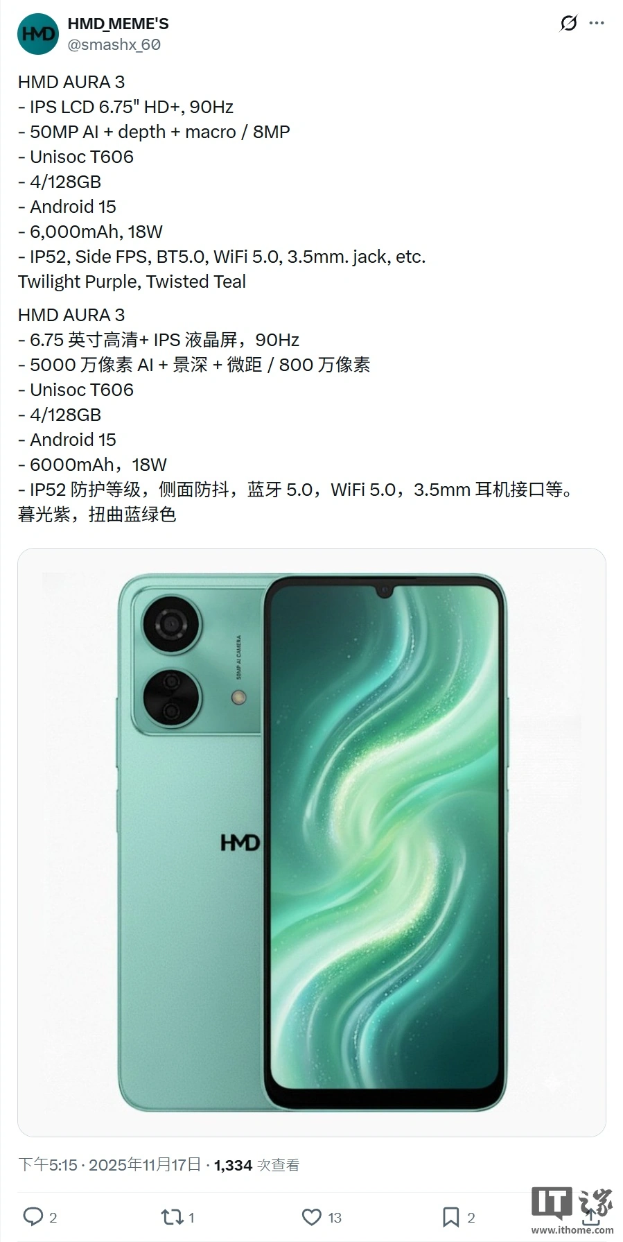 IT之家 11 月 30 日消息,消息人士 HMD_MEME’S 上周(11 月 17 日)在 X 平台发文,曝光尚未正式发布的 HMD Aura 3 手机。