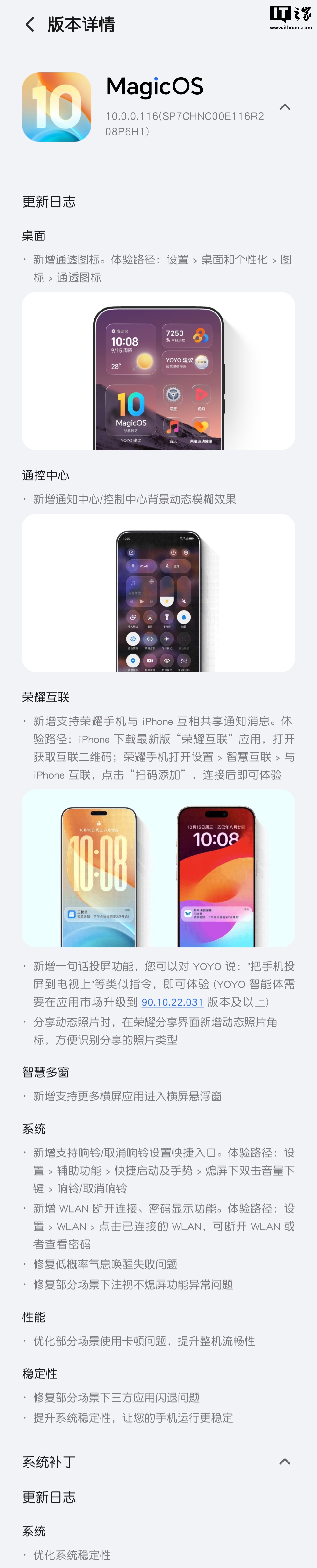 IT之家附荣耀 Magic5 系列手机本次更新内容如下: