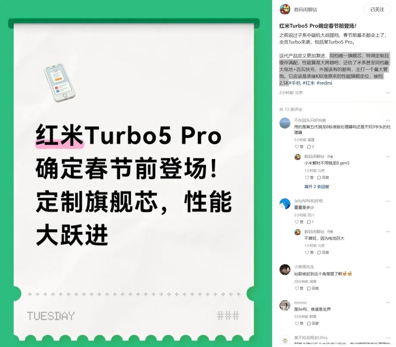 IT之家 12 月 2 日消息,博主 @数码闲聊站 今日发文透露,小米 REDMI Turbo5 Pro 手机将在春节前登场。博主表示,这代产品定义更加激进,搭载同档唯一旗舰芯,特调定制且缓存满配,性能算是大跨越。