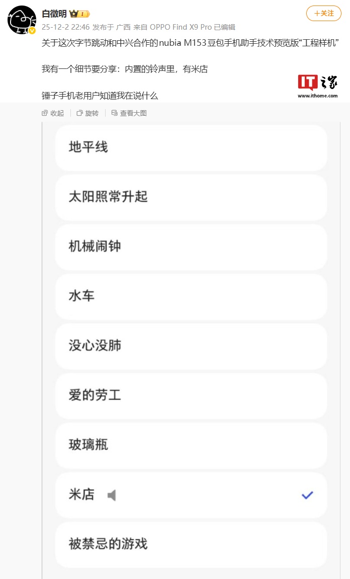 另外,博主 @白徵明 还发现,该机内置的铃声里有“米店”(IT之家注:铃声“米店”是锤子手机的内置手机铃声之一)。