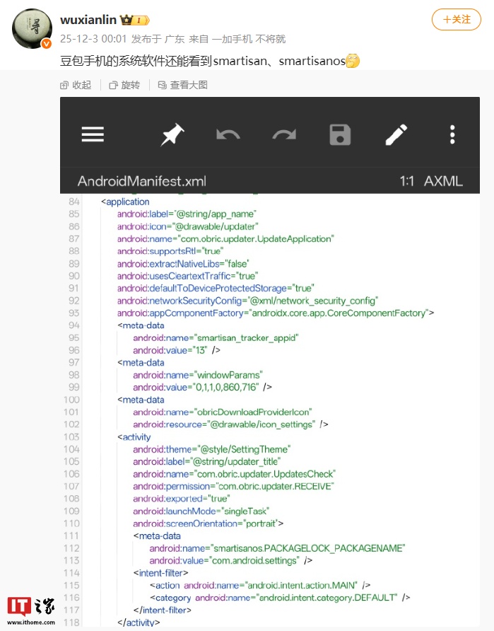 IT之家 12 月 3 日消息,博主 @wuxianlin 今日分享了豆包手机的系统软件,发现了锤子科技遗留字样,称还能看到 smartisan、smartisanos。