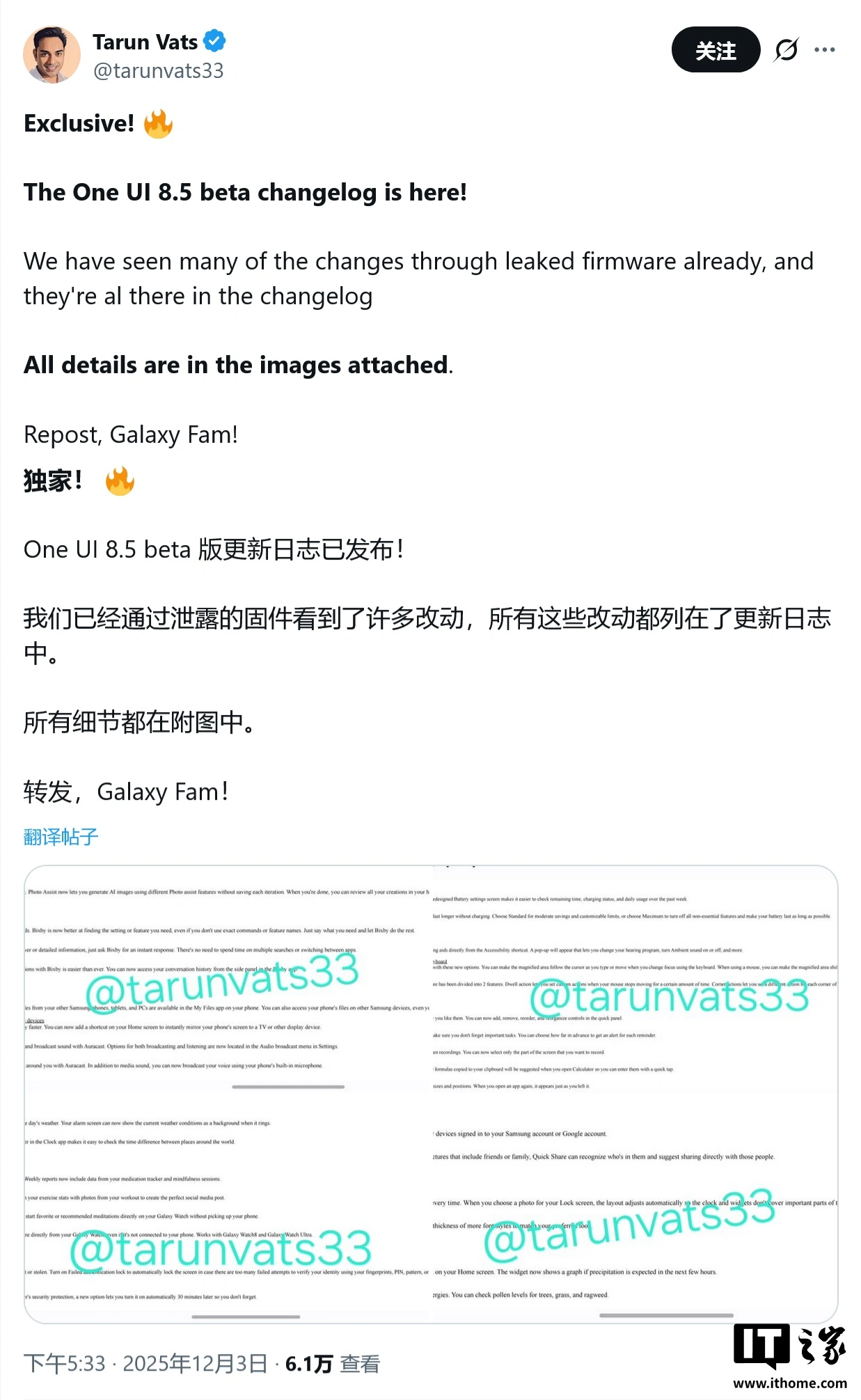IT之家 12 月 4 日消息,消息源 @tarunvats33 昨日(12 月 3 日)在 X 平台发布推文,分享了一组截图,展示了 One UI 8.5 测试版完整更新日志,预示着三星将于 12 月开启系统测试。