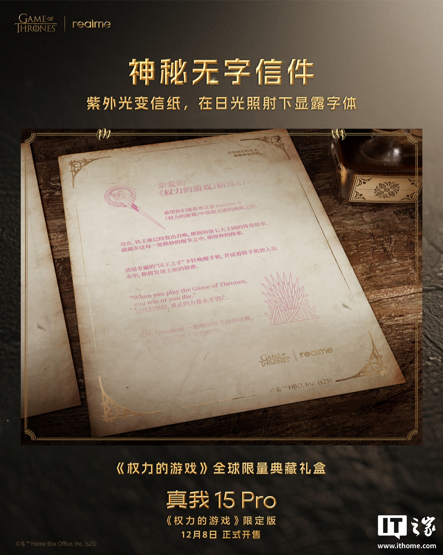 文章来源于互联网:IT之家-realme 真我 15 Pro《权力的游戏》限定版典藏礼盒公布:含「国王之手」形象卡针、紫外光变信件等