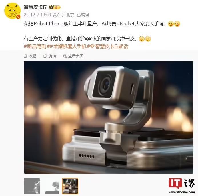 IT之家 12 月 8 日消息,博主 @智慧皮卡丘 昨日发文透露,荣耀 ROBOT PHONE 将在明年上半年量产,主打“AI 场景 +Pocket”,拥有生产力定制优化,可满足直播 / 创作需求。