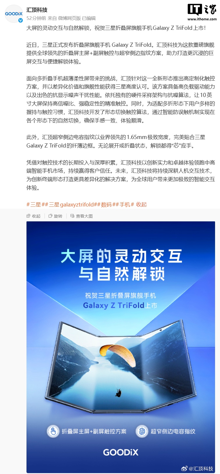 IT之家 12 月 8 日消息,汇顶科技今天在微博发文,对三星首款三折叠手机 Galaxy Z TriFold 进行“认领”。