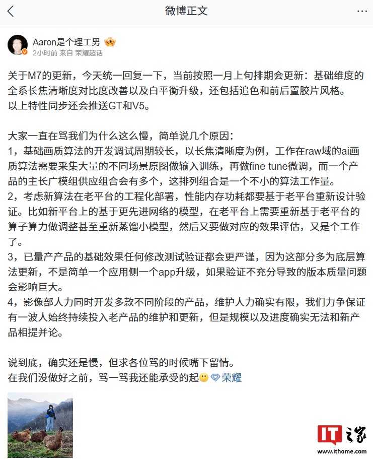 荣耀影像系统专家 @Aaron是个理工男 还提到,以上特性同步还会推送 GT 和 V5 机型。另外,他还解释了更新慢的原因: