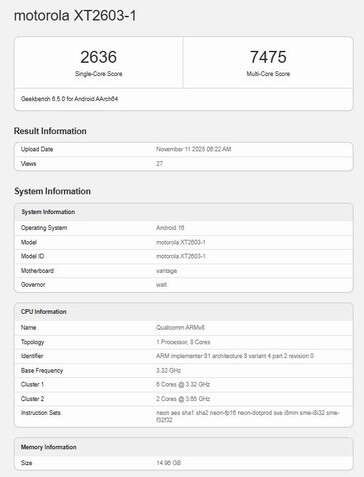 Geekbench 数据显示,该机单核成绩为 2636 分,多核成绩为 7475 分,同时确认将提供 16GB RAM 版本,并预装安卓 16 操作系统。