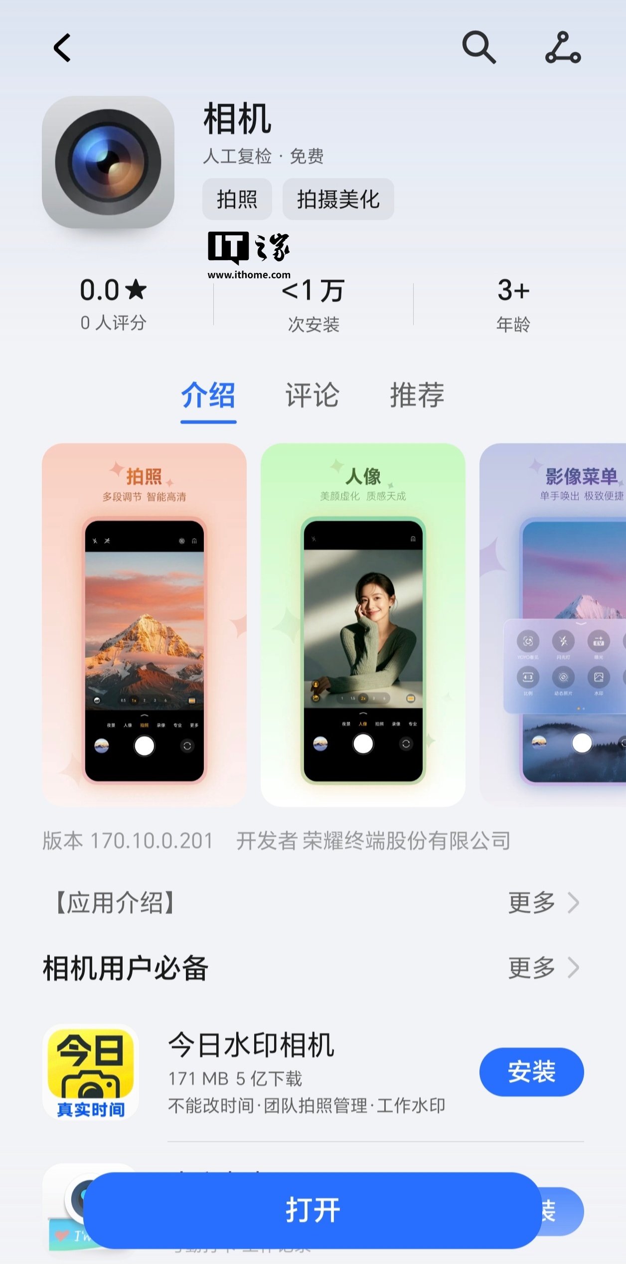 IT之家 12 月 9 日消息,据用户反馈,荣耀相机 App 已解耦上线荣耀应用市场(Magic8 系列等机型可搜索查看),当前版本为 170.10.0.201,最近更新内容为修复已知问题,稳定性提升。