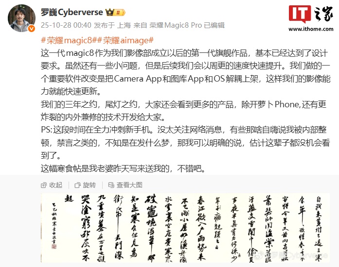 据IT之家此前报道,荣耀首席影像工程师罗巍 10 月 28 日发文称,Magic8 作为影像部成立以后的第一代旗舰作品,基本已经达到了设计要求。