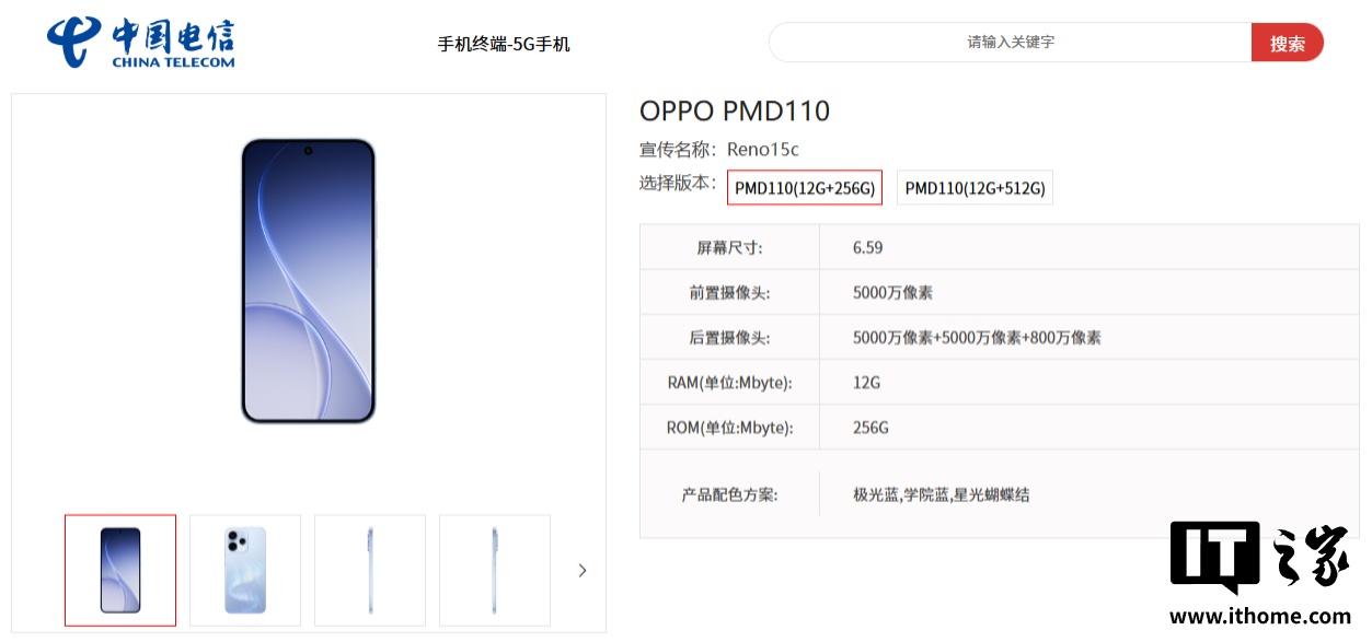 OPPO Reno15c 手机现身中国电信终端产品库:最高 12GB+512GB 规格、内置 6500mAh 电池