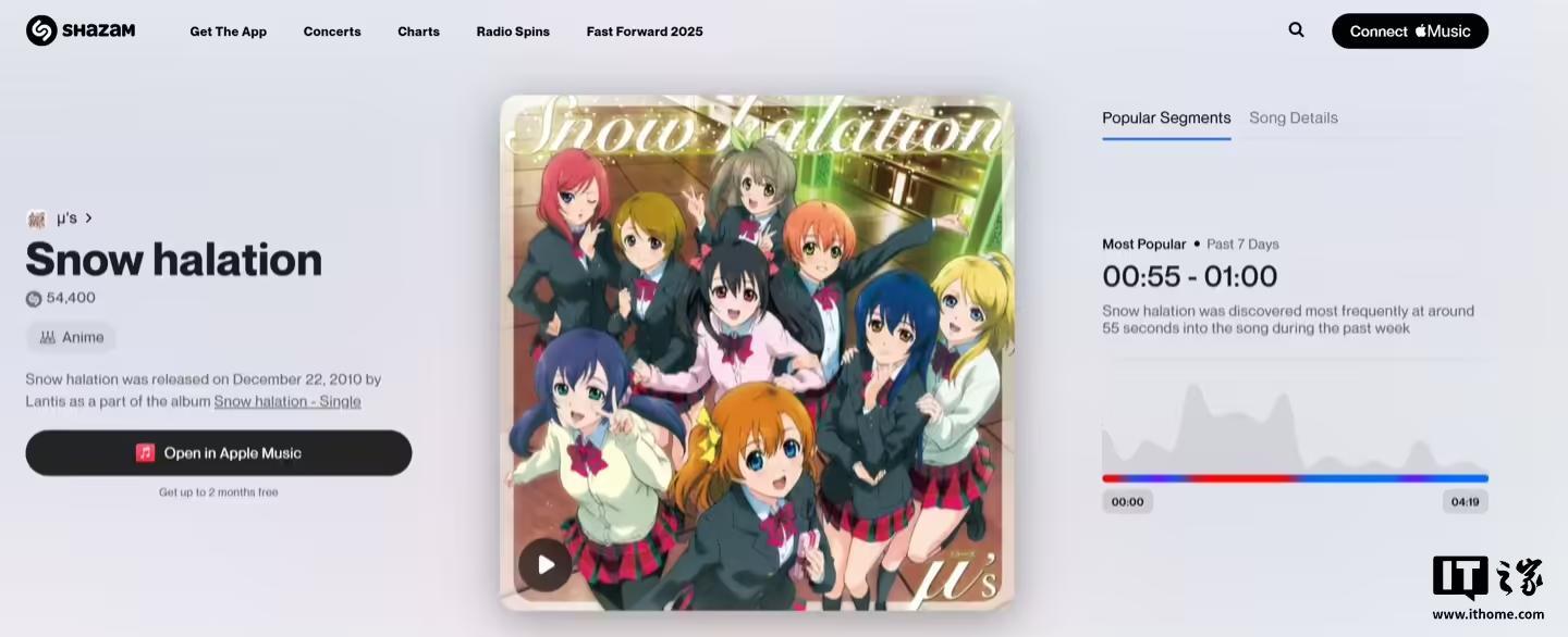 IT之家对此进行实测,该功能已在网页版 Shazam 中上线,以 μ’s 的《Snow halation》为例,最近一个星期内大部分听众会在 55 秒至 1 分钟整时打开 Shazam 识别歌曲,同时 55 秒到 1 分钟 40 秒的热力值最高,显示大部分听众会直接跳转到这一部分。
