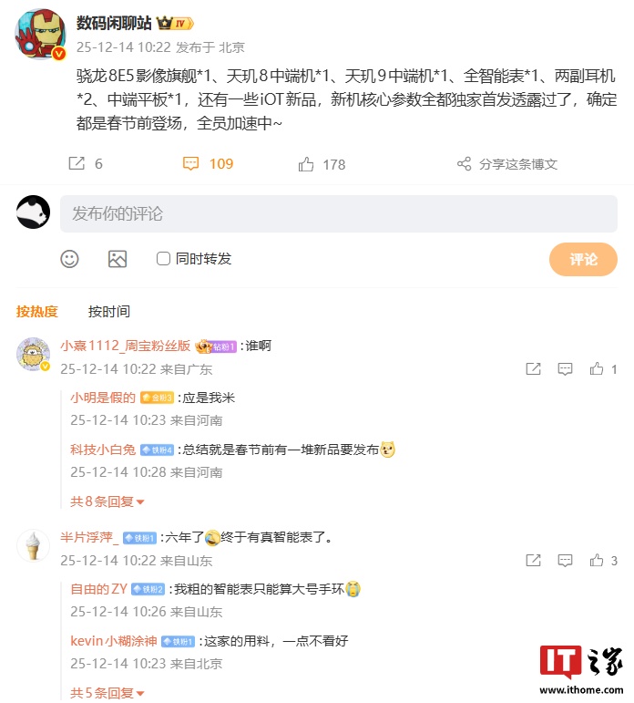 IT之家 12 月 14 日消息,博主 @数码闲聊站 今日发文透露了某厂(结合评论区讨论来看,该厂商为小米)确定在春节前发布的新品内容:
